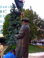A szegedi hivatalokban fontosabb a VIP vendégek megkímélése néhány méter plusz gyaloglástól, mint a mozgássérültek segítése. A Megyeháza előtti téren kijelöltek fenntartott parkolóhelyeket, balra a mozgássérülteknek és a jobbra VIP vendégeknek, 3-3 darabot. A mozgássérültek parkolóhelyei kerültek messzebb a bejárattól. Igaz a lépcsőn sincs nekik feljáró, mert azt a tér jobb oldalára tették, a Nagy Imre szobor mögé. Tehát a kerekes székes mozgássérült leparkol, kikerüli a VIP-s autókat, megkerüli Nagy Imre talapzatát, kikerekezik a tér másik oldalár, majd felgurul az igencsak keskenyre tervezett feljárón. Ennyi. Innen már nem jut sehova, mert az épületbe már nincs akadálymentesített bejárat. Odagurulhat a lépcső éle és várhatja, hogy kijöjjön valaki vagy közelről megnézheti Nagy Imrét. Megkérdeztem, hogy juthatnak be. A recepciós válasza: